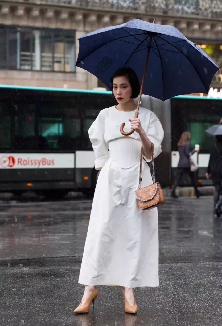 2019秋冬巴黎时装周上,张钧甯一席Lanvin白色不规则蝙蝠袖连衣裙,搭配V口女巫鞋简洁利落,优雅的古典气息浓厚。