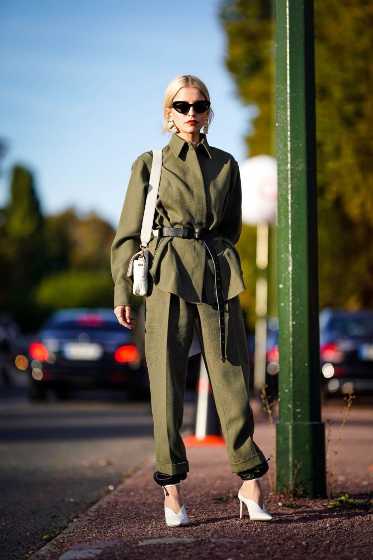 2019春夏巴黎时装周街拍,时尚博主Caroline Dau一套绿色廓形军装风suit,鞋包同色,温柔的纯白色调中和了中性风,帅气与柔美并存~