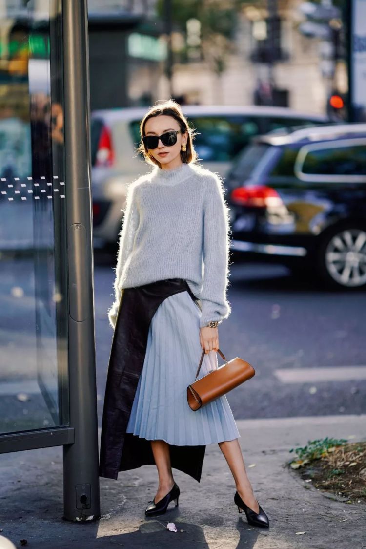 2019春夏巴黎时装周街拍潮人,温柔的马海毛毛衣,搭配天蓝色顺色拼接百褶裙,既保暖又充满轻盈感。