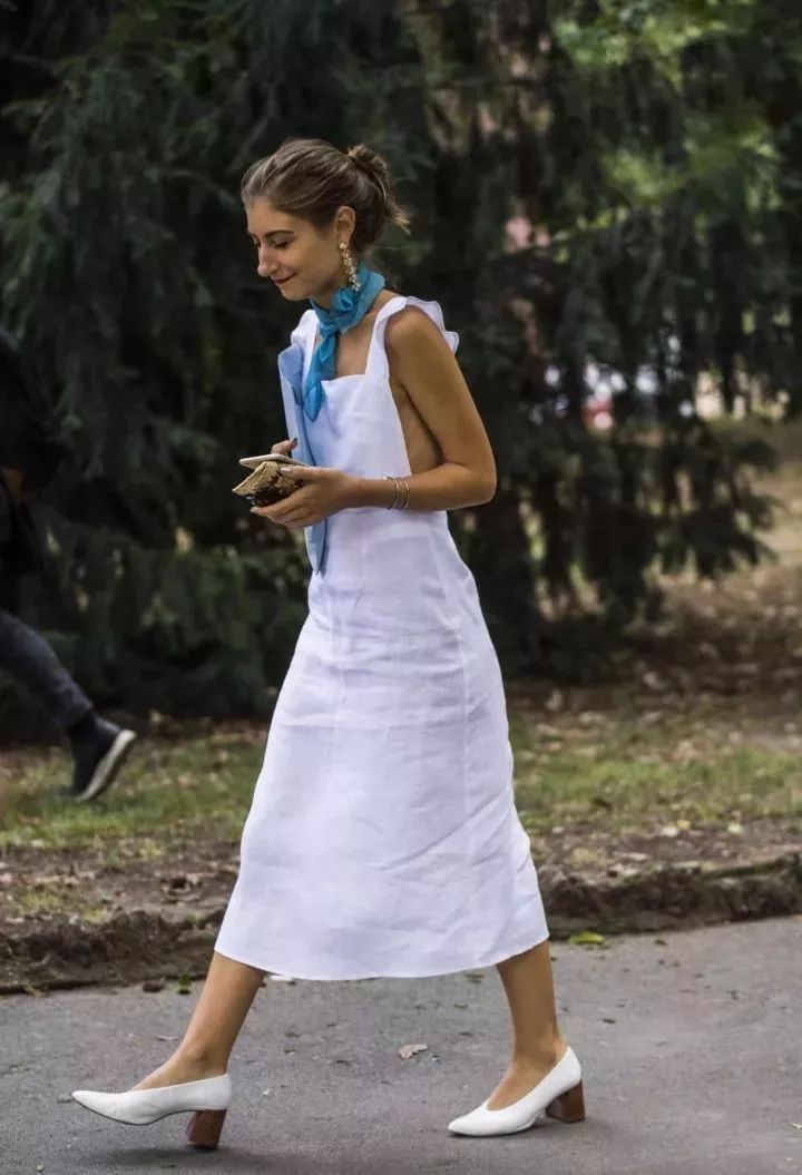 时尚博主Jenny Watson堪称法式清新本新。白色吊带荷叶边连衣裙搭配白色女巫粗跟鞋,蓝色领巾点缀自带风情。