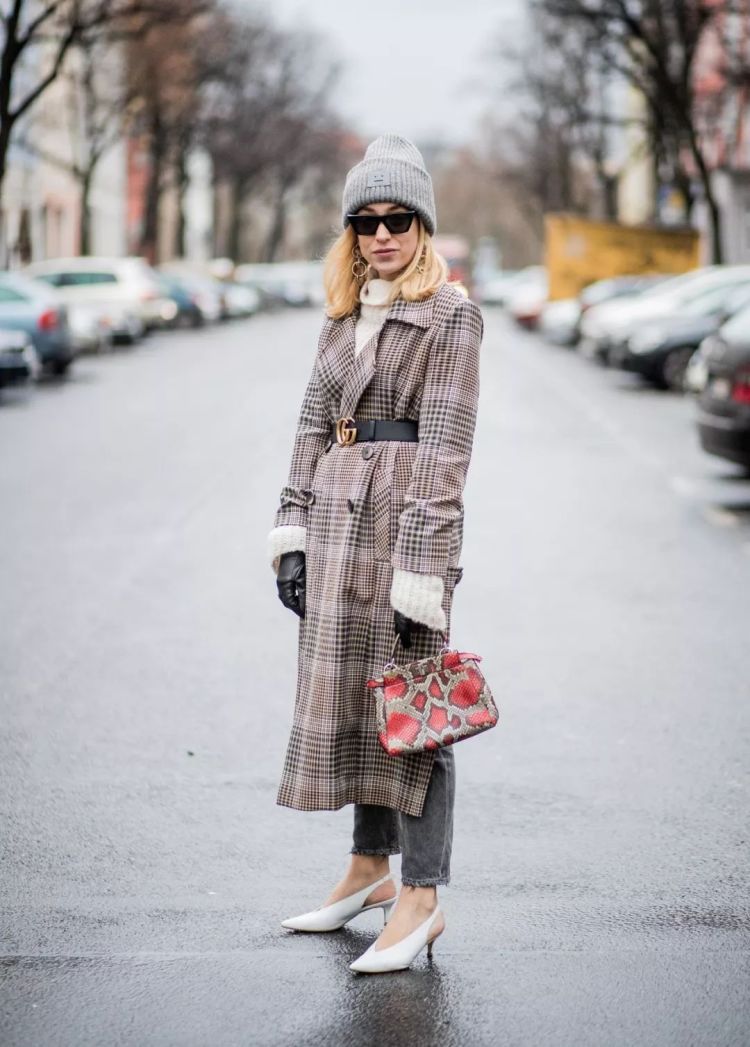 时尚博主Sonia Lyson街拍,头戴灰色Acne针织帽,灰色格子双排扣大衣搭配下穿灰色九分牛仔裤,上脚一双白色尖头露跟女巫高跟鞋,整体就十分和谐高级。