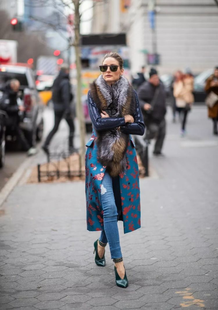 2019纽约时装周潮人街拍,厚重的皮草提花拼接大衣,搭配同色系skinny牛仔裤,缎面的浅口女巫鞋上脚,立刻将气场提高了N个档次。