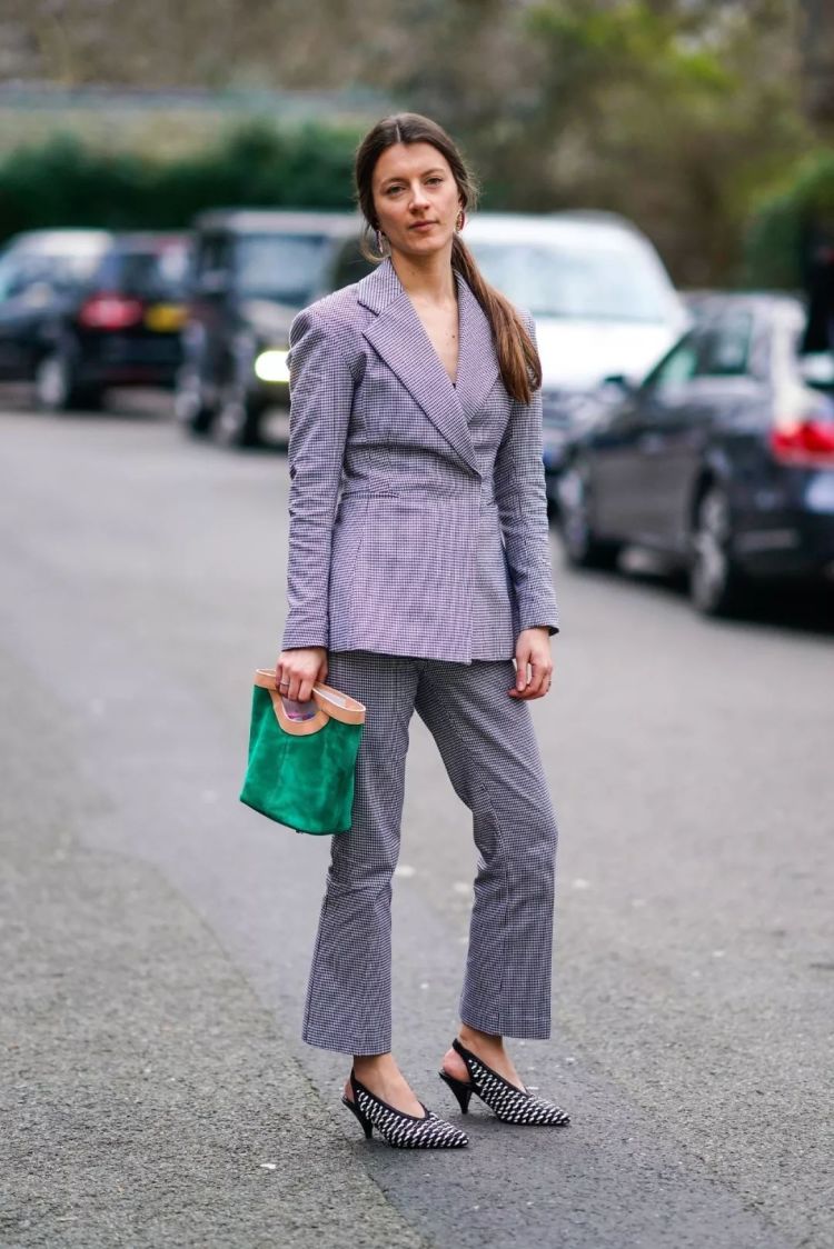 小猫跟尖头女巫鞋,搭配驼色手袋,得体而富有慵懒感。