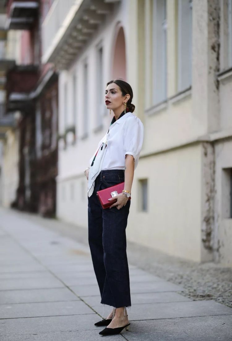 时尚博主Masha Sedgwick街拍,宫廷袖白衬衫半塞进直筒阔腿牛仔裤里,粉色Miu Miu Mini手袋,搭配Jacquemus穆勒女巫鞋,尽显法式清新职业风。
