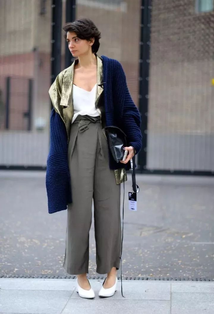 简洁白色吊带+军绿色纸袋裤+复古V口鞋,清爽舒适,层搭了同色系金属感外套和藏青色开衫,叠穿时髦double。