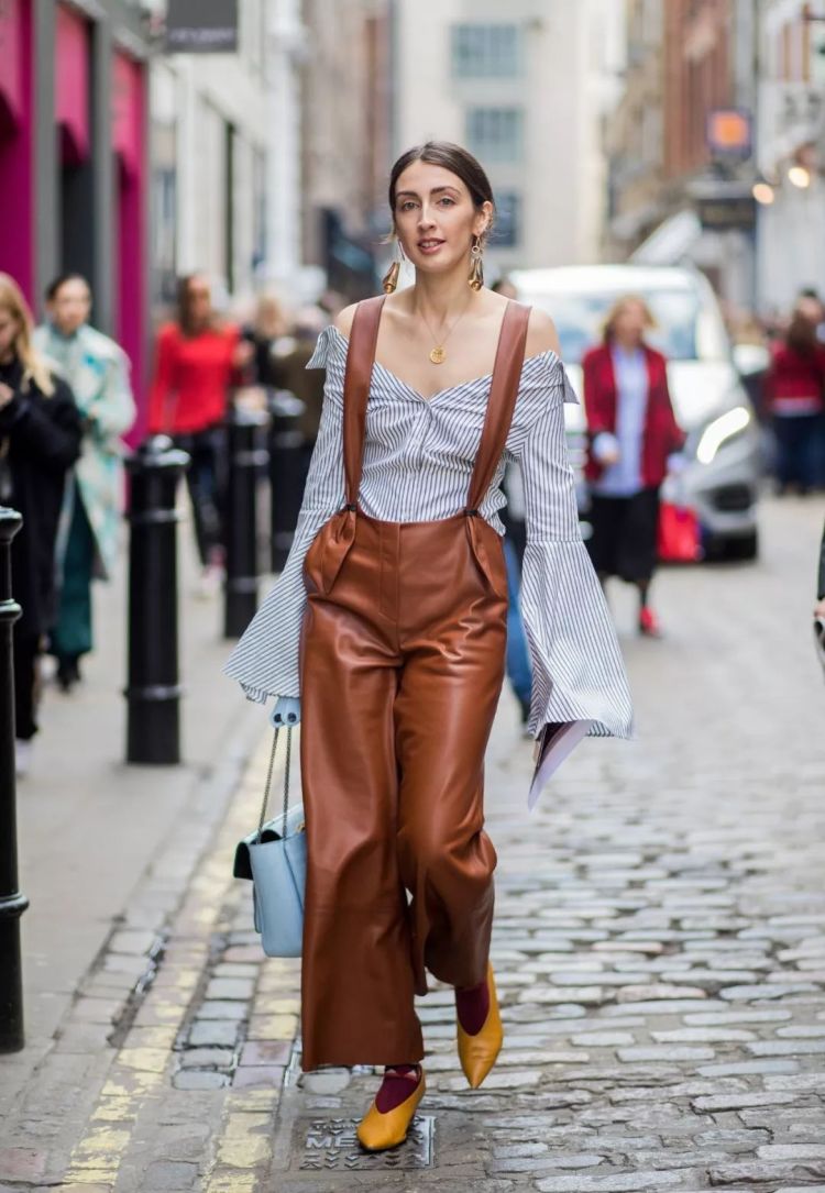 露得多不如露的妙。伦敦时装周上的街拍潮人,oversize水袖条纹衬衫+双肩吊带阔腿皮裤,同色系袜子撞色日落黄女巫鞋。