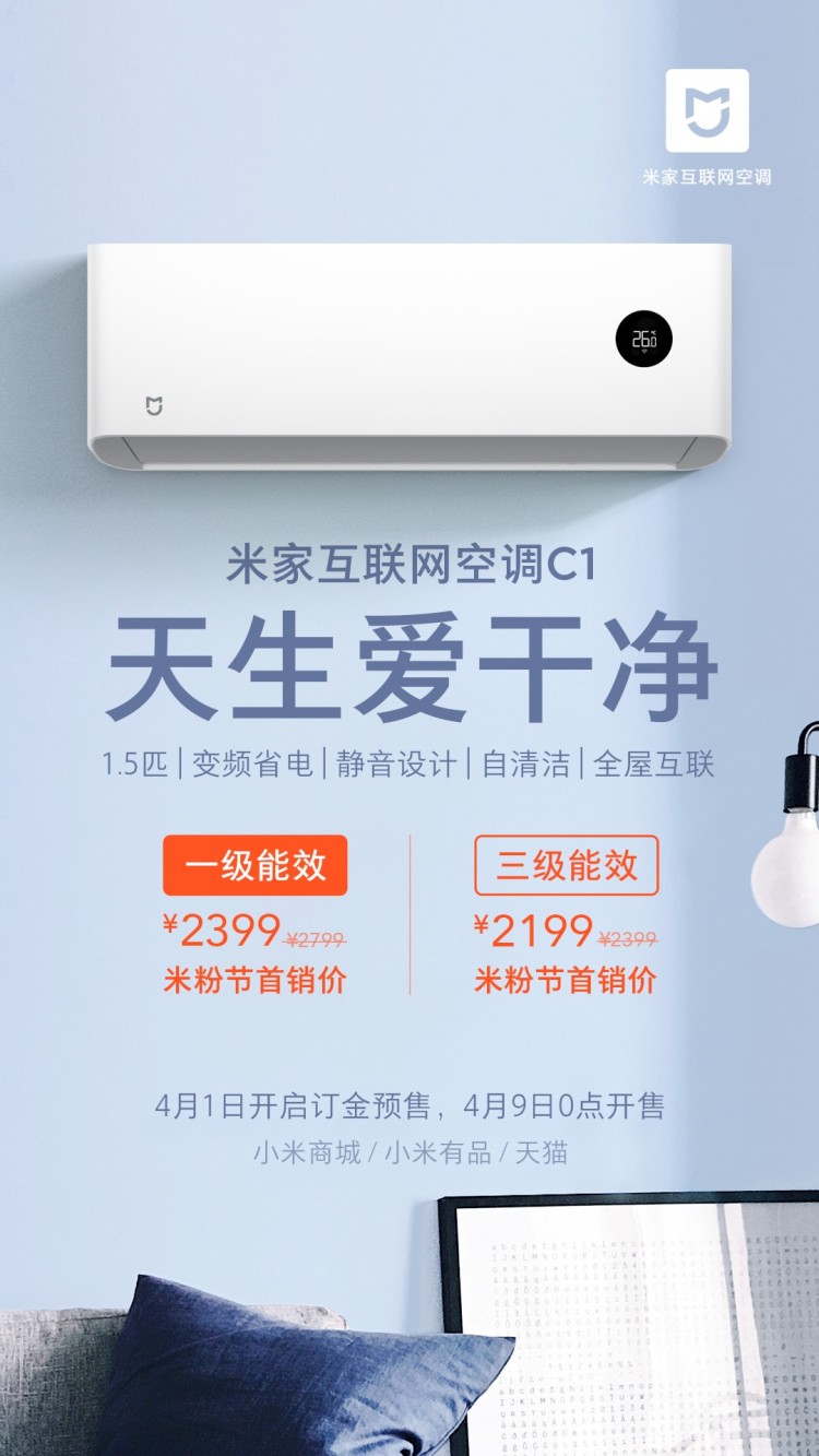 2019年4月1日,米家互联网空调C1系列正式发布,作为小米全家桶新成员,支持米家app远程控制和小爱同学语音控制,并首次引入自清洁功能,结合全直流变频一级能效带来的静音节能高级体验,让用户使用更加安心、省心。4月1日,米家互联网空调C1将在小米商城、小米有品和天猫商城开启订金预售活动,4月9日全网开卖,米家互联网空调C1一级能效售价2799元,米粉节首销价2399元,米家互联网空调C1售价2399元,米粉节首销价2199元。