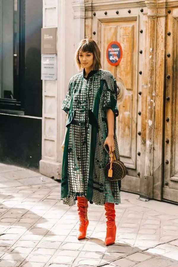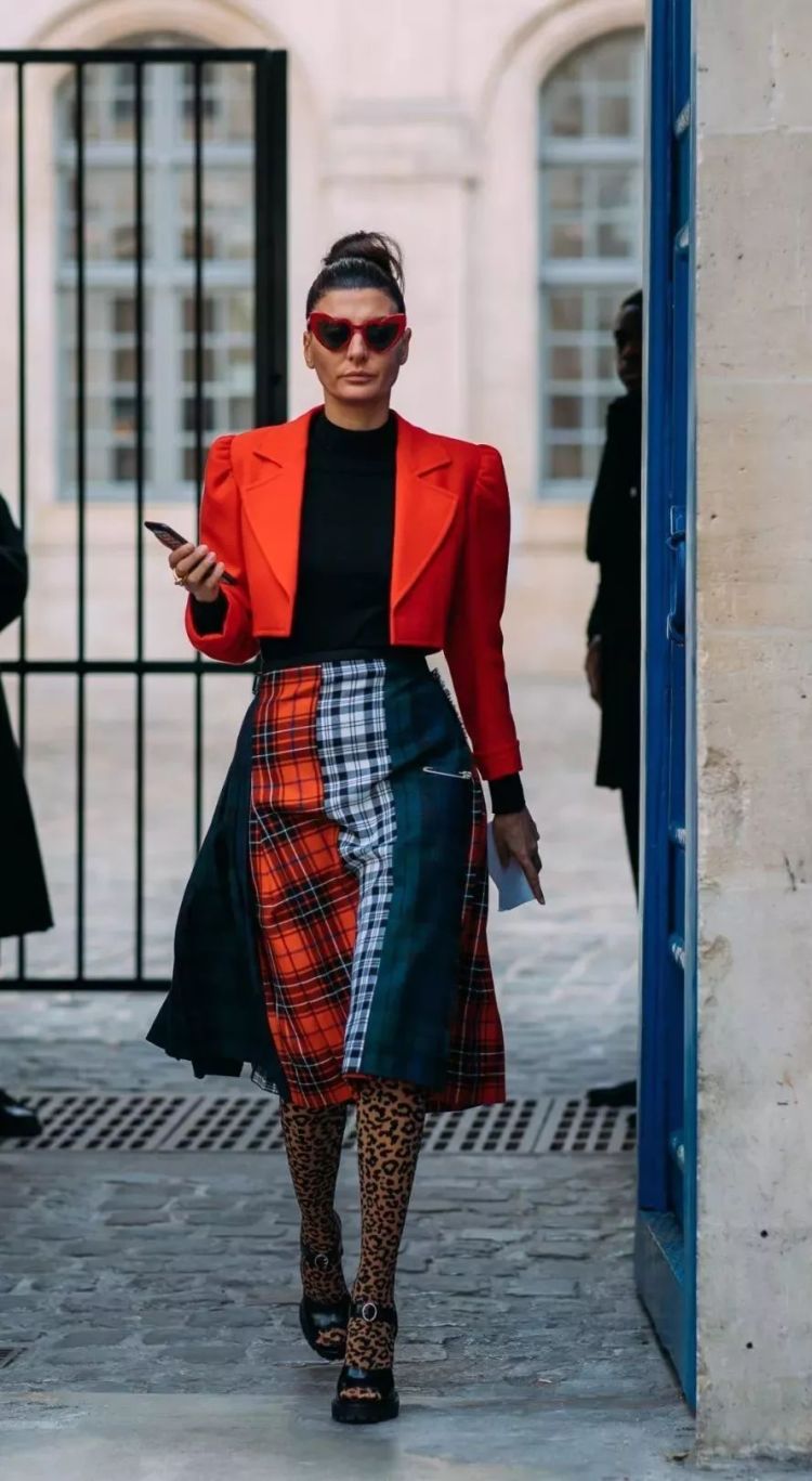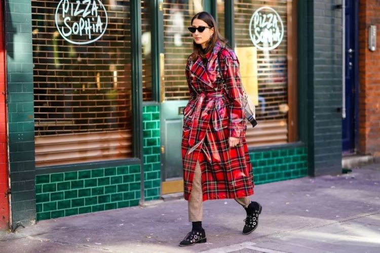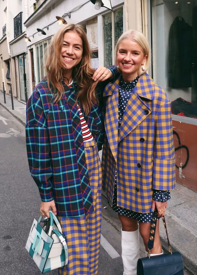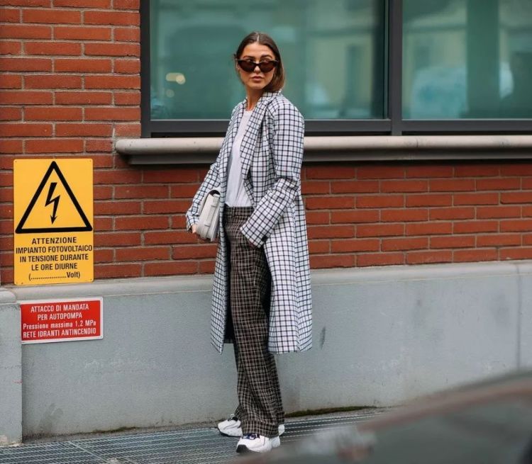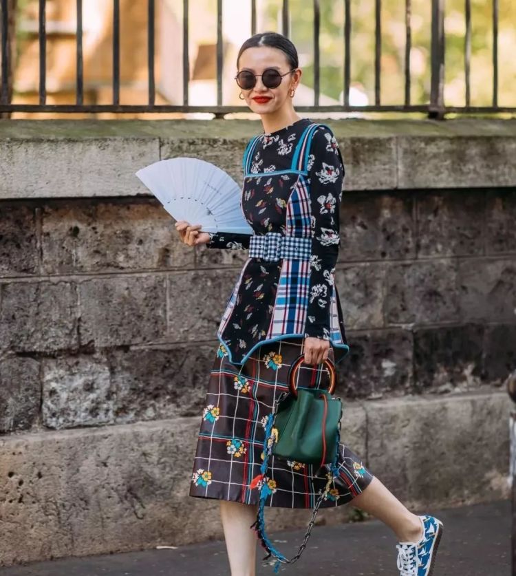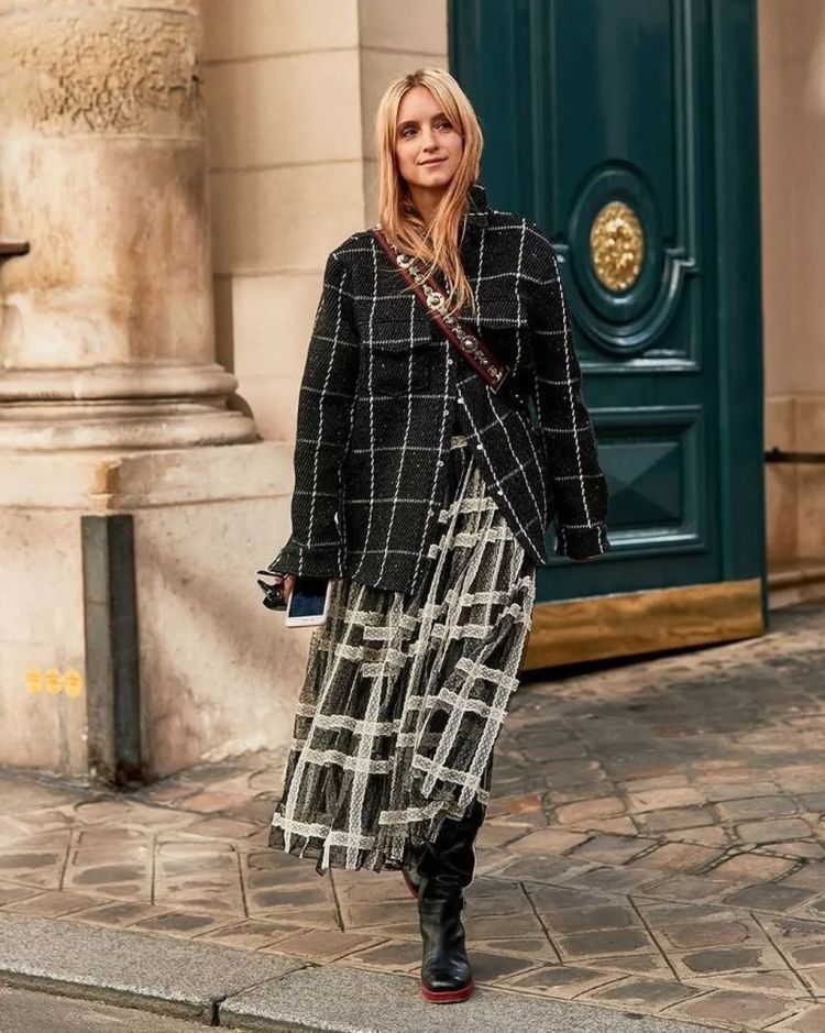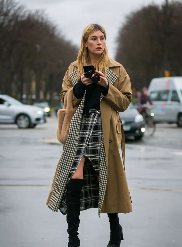 时尚博主Camille Charriere则用更加小号的格纹风衣内衬与大号的格纹半裙相互碰撞,将优雅与不羁完美融合。