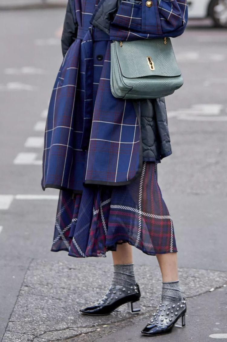 同色系的苏格兰格纹要想撞得高级,也可以用材质的薄厚形成视觉的反差,在这个乍暖还寒的时候还能快人一步地穿上纱裙,赢了!