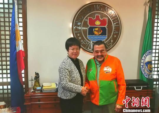 4月26日,菲律宾前总统、现任马尼拉市市长埃斯特拉达在马尼拉市政厅接受中新网记者采访后,合影留念。 马尼拉市政厅供图 摄