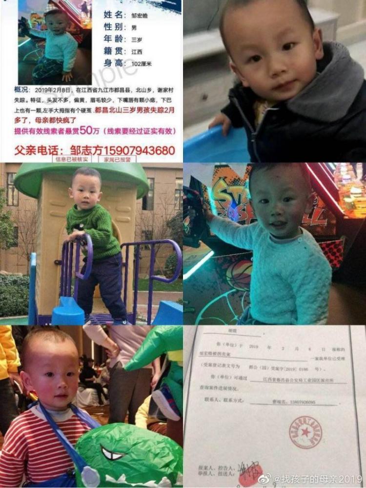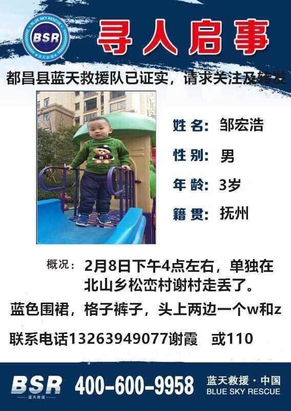 2月8日,本是春节期间走亲访友的团圆日子,这一天,江西抚州市谢女士3岁大的儿子邹宏皓在外婆家附近失踪。当天,谢女士及家人在屋内休息,小宏皓与其他孩子同在屋内玩耍。4点左右,邹宏皓自行前去屋外小便,随后不见踪影。不到半小时,家人就发现邹宏皓不见了。有邻居曾告知谢女士,在孩子失踪的这段时间,似乎听到有孩子哭声。但附近区域并无监控,无法获取孩子行踪。