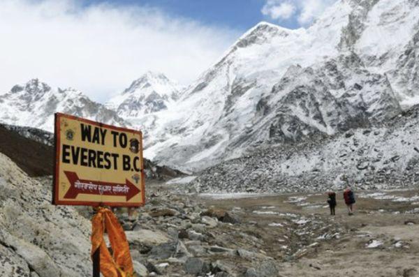 在2018年4月26日拍摄的这张照片中,一个标志指向珠峰大本营。两名徒步者正在尼泊尔首都加德满都东北140公里处索鲁孔布地区(Solukhumbu)的珠穆朗玛峰地区行走。