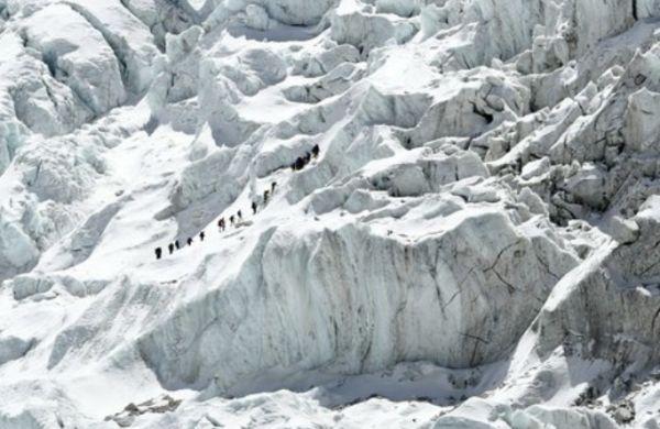 在2018年4月24日拍摄的这张照片中,登山者从加德满都东北140公里处的珠峰大本营出发,穿过珠穆朗玛峰的昆布冰川。