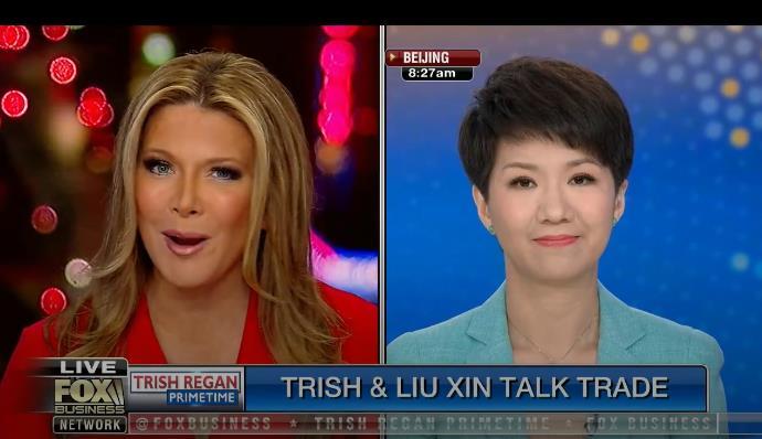 北京时间5月30日早8时26分26秒(美东时间5月29日晚8时26分26秒),中央广播电视总台中国国际电视台(CGTN)知名女主持人刘欣应美国福克斯商业频道(Fox Business)女主播崔西•里根(Trish Regan)邀请,与其就中美摩擦等相关议题进行一场面对面、直击焦点的“跨洋对话”。刘欣在北京演播室通过卫星连线,在崔西主持的节目《崔西•里根黄金时段》(Trish Regan Primetime)中以嘉宾身份出现。