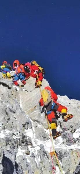 两侧是峭壁,前方是排成长龙、缓慢挪动的登山人员,脚下则是海拔8800米,只能勉强容下一人站立的窄道,前进举步维艰,后退同样艰险。