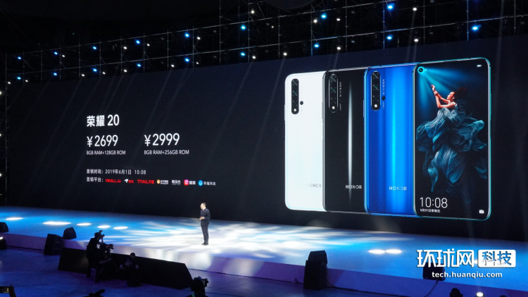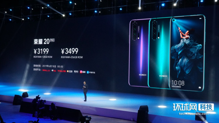 配色方面,荣耀20提供幻影蓝、幻夜黑、冰岛白三种选择;荣耀20 Pro提供蓝水翡翠和幻夜星河两种选择。