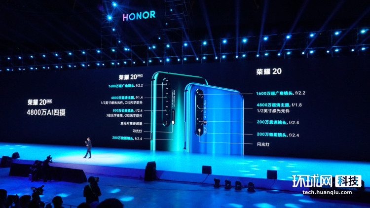 荣耀20系列国内版打出的口号是“定格奇幻之美”,重点突出了拍照能力,前置3200万像素AI自拍摄像头;荣耀20 Pro后置四摄分别是:索尼IMX586 4800万主摄,1/2英寸感光面积,业界最大f/1.4夜景光圈、双四轴光学防抖、ISO最高204800;1600万像素117°广角镜头;800万长焦镜头,支持3倍数字边角,最高30倍数字变焦;200万像素微距镜头。荣耀20只将800万长焦镜头替换为200万像素景深镜头,主摄光圈f/1.8,ISO最高为102400。