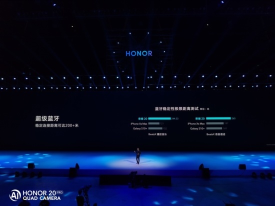 荣耀20系列此次还带来了超级蓝牙功能,相比普通蓝牙功能拥有更强的穿透力,在无障碍测试时,蓝牙连接beatsX耳机进行听音乐和打电话,荣耀20系列极限距离可达200米+,远超于同期旗舰。