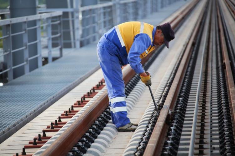 ▲中铁大桥局中俄同江铁路大桥项目的建设者正在对钢轨精度进行微调(6月4日摄)。本报记者谢锐佳摄