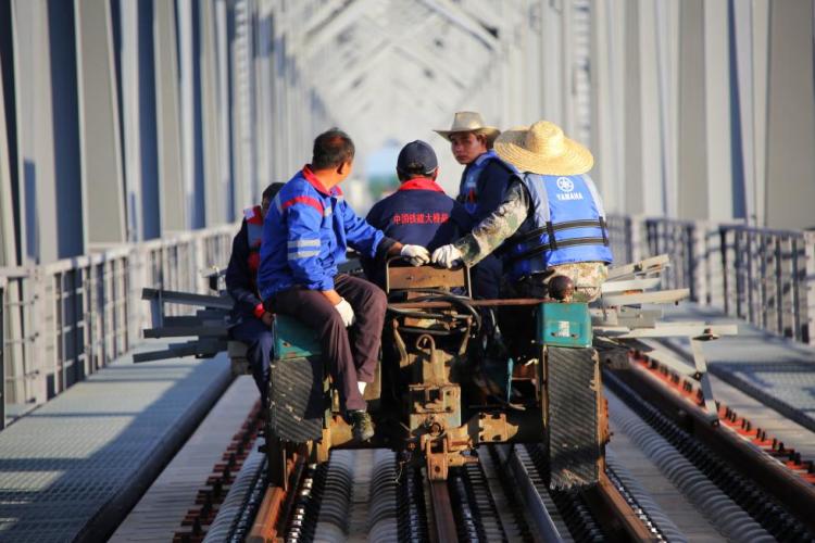 ▲中铁大桥局中俄同江铁路大桥项目的建设者正在对钢轨精度进行微调。(6月4日摄)本报记者谢锐佳摄