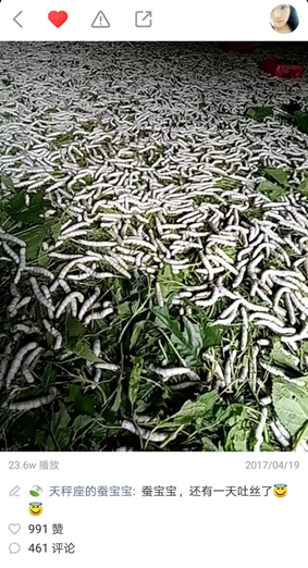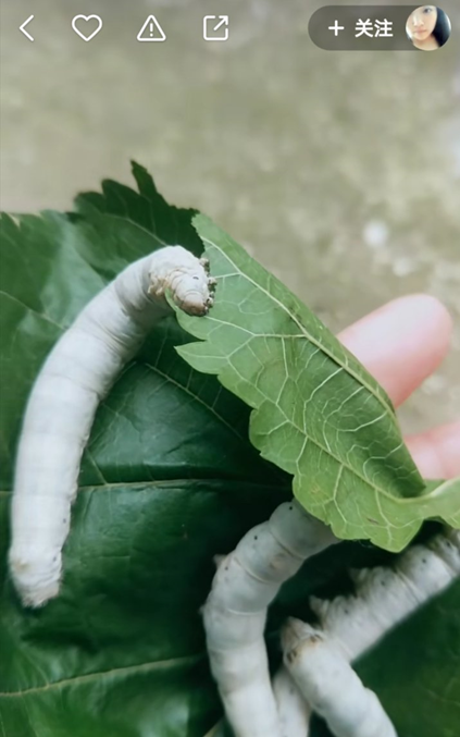 返乡不久,石兰在自己的快手账号上(快手ID:canbb1818)发了第一条蚕宝宝的视频。镜头下,白白胖胖的成虫密密麻麻的躺在叶子上面。“蚕宝宝还有一天就吐丝了”,一句简单的介绍,激起了快手老铁们的兴趣。“只听说过蚕吐丝,还真没亲眼见过”,“好奇是怎么把这些蚕养活的”……石兰的视频获得了20多万的播放量,评论也达到了400多条。