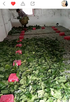 在石兰的快手上,最常见的就是一家人一起捡桑叶。早上4:30起床,用前一天的桑叶喂饱蚕宝宝后,一家人开始上山捡桑叶。如果遇上下雨天,还要把叶子晾干,处理好的叶子作为蚕的午餐。下午4点左右,三个人又上山捡叶子。“每天干活很累也很枯燥,幸好有快手用户们的陪伴。”从大城市返乡后,除了家乡的归属感,石兰还在快手上获得了另一种归属感——对养蚕职业的认同和热爱。一改自己多年前“厌弃养蚕,向往城市”的想法。