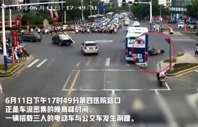 6月11日下午17时49分,一段发生在江西新余市仙来东大道和沿江路北交口、孔目江红绿灯口位置的监控视频引发关注。视频中,一辆搭载一位老人和两个孩子的电动车与公交车发生剐蹭,电动车上的3人连人带车翻倒在地,老人和一个孩子挣扎着爬起来,但另一个孩子疑似腿部受伤,挪动几步后坐在了路边。