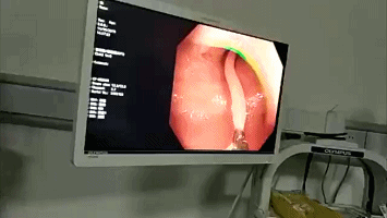 如何取出异物?在一旁的方晓明主任医师指导下,通过内镜下,用活检钳轻轻钳住虫子头部后,再慢慢把它从肠道里拖了出来。