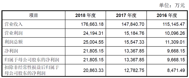 减速机是工业动力传动不可缺少的重要基础部件之一,产品广泛应用于国民经济各大行业。近三年,随着我国经济稳步发展,减速机市场规模亦持续增长,国茂股份业务发展态势一直良好、持续稳定。2016 年度、2017 年度和2018 年度营业收入分别为115,145.47 万元、147,840.70 万元和176,663.18 万元,分别同比增长4.58%、28.39%和19.50%;2016 年度、2017 年度和2018 年度净利润分别为9668.15万元、13367.85万元、21805.15万元,其中2017、2018年度净利润分别同比增长50.89%、63.21%。如下图1: