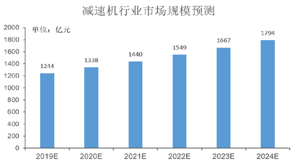 根据前瞻产业研究院出具的《2019-2024 年中国减速机行业市场前瞻与投资战略规划分析报告》,预计“十三五”期间我国减速机行业将实现较快速度增长,到2024 年减速机行业收入规模将达到1,794 亿元,前景巨大。如下图2: