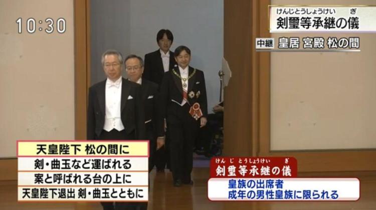 仪式间,德仁天皇首先走入宫殿中,随后由侍从依次将剑、勾玉,随后国玺、御玺象征物置于“案”上,德仁天皇向众人微鞠躬示意。稍作停顿后,侍从再将剑和勾玉取走,走出宫殿,德仁天皇跟随出宫后,其余两侍从取走国玺和御玺,整个仪式正式结束。