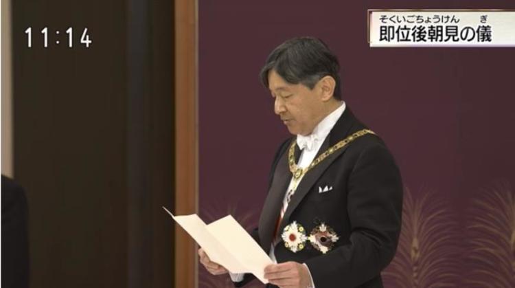 在此,我们刚刚听到了英年才俊的天皇陛下的赠言,陛下表示深念上皇陛下之品格,并表示在依据日本宪法、作为日本国民及国民统合象征履行职责的同时,期望国民幸福、国家进一步发展,并祈盼世界和平。