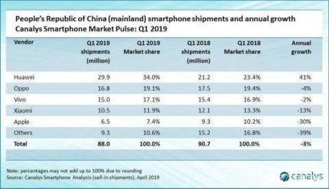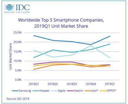 另外,根据报告,2019年一季度,中国智能手机市场同比萎缩 3%,总出货量具体为 8800 万部,为六年来最差的市场表现。