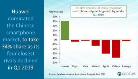 华为品牌的智能手机依然是中国手机市场领导者,是一季度出货量排名前五的手机厂商中,唯一一家没有下降并且还是逆势增长的手机厂商,华为(包括荣耀)的智能手机出货量达到了2990 万部,市场份额增长到了创纪录的 34%,较去年同期增长超过 10%。