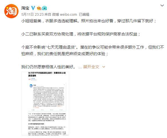 淘宝官方微博5月11日晚回应“买18件衣服旅游后要退货”:个案不会影响“七天无理由退货”,依然相信人性美好。同时,淘宝已面向所有商家推出超级保障计划,将聚合平台内各项权益保障,通过规则、产品、工具及服务等保障商家的正当权益。