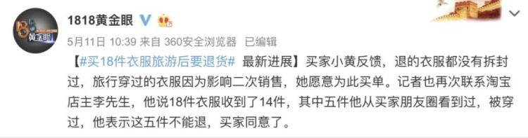 中国青年报(ID:zqbcyol)也注意到,1818黄金眼在11日上午更新了事件的后续:淘宝店主李先生说,18件衣服收到了14件,其中五件他从买家朋友圈看到过,被穿过,他表示这五件不能退,买家同意了。