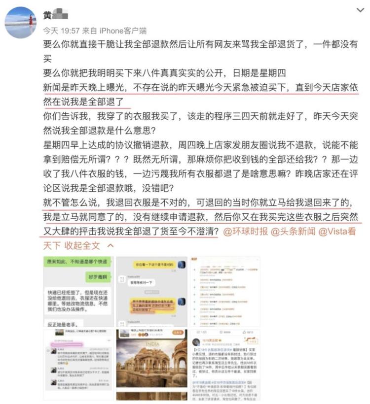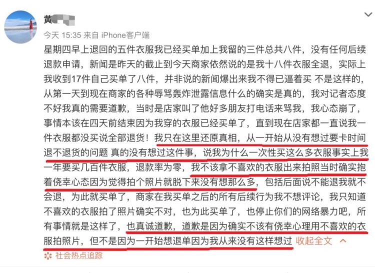 11日,买家黄小姐通过微博回应此事称,自己一年要买几百件衣服,但退款率为零,从一开始她就没有想过要退货、要卡时间等等。