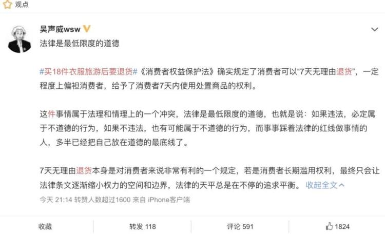 也有法律博主在微博提醒,7天无理由退货本身是对消费者来说非常有利的一个规定,若是消费者长期滥用权利,最终只会让法律条文逐渐缩小权力的空间和边界。