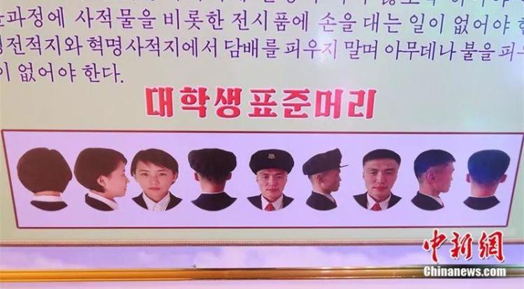 2019年4月,在平壤教员大学的走廊里,贴着一张“大学生标准发型图”,没有第二种选择。从图片来看,女生需要留蘑菇头,刘海不超过眉毛,两边的头发整齐地梳在耳后。男生则是1-2厘米的毛寸头,耳朵下面的头发被齐齐刮掉。