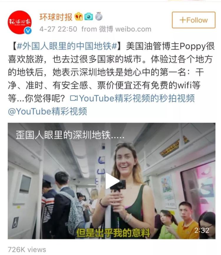 热爱旅游的美国博主Poppy也录了视频,称深圳地铁是她心中的No.1,干净准时,票价便宜还有wifi呢!