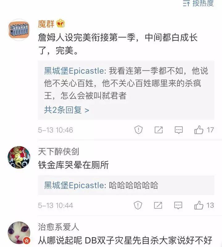 “可以说后来原著党都佛系看剧了。但我觉得最难以接受还是瑟曦詹姆的死吧。问题是无论书还是剧,都安排了掐死的预言。可这一集里就这样莫名其妙死了。这一季还有另外的是一些人死得相当莫名其妙。”