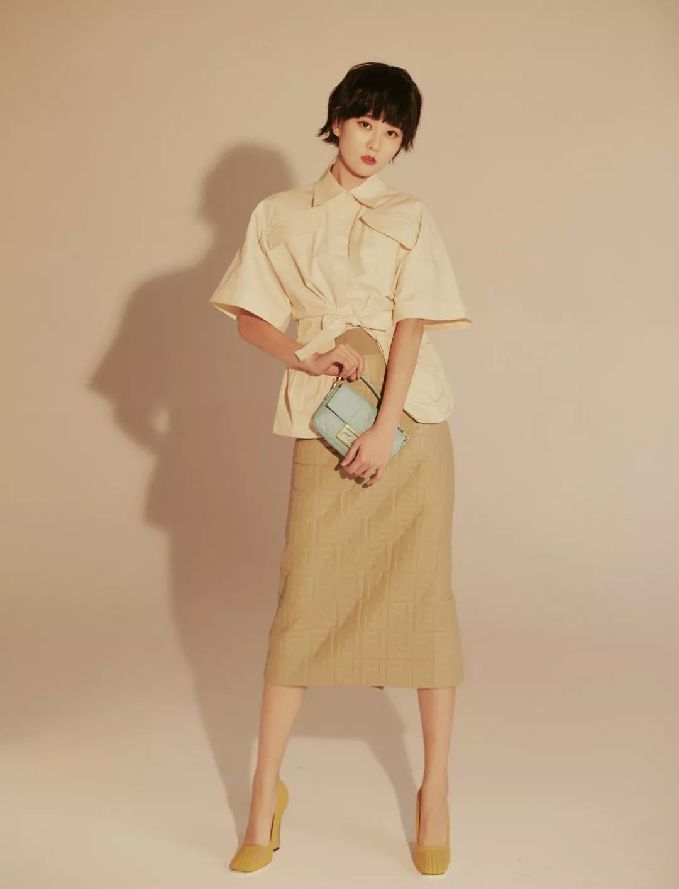 乔欣也穿过类似款的Fendi2019春夏系列系带衬衫,鹅黄色装饰衬衣与橄榄绿压纹皮质半身裙,清新有活力。