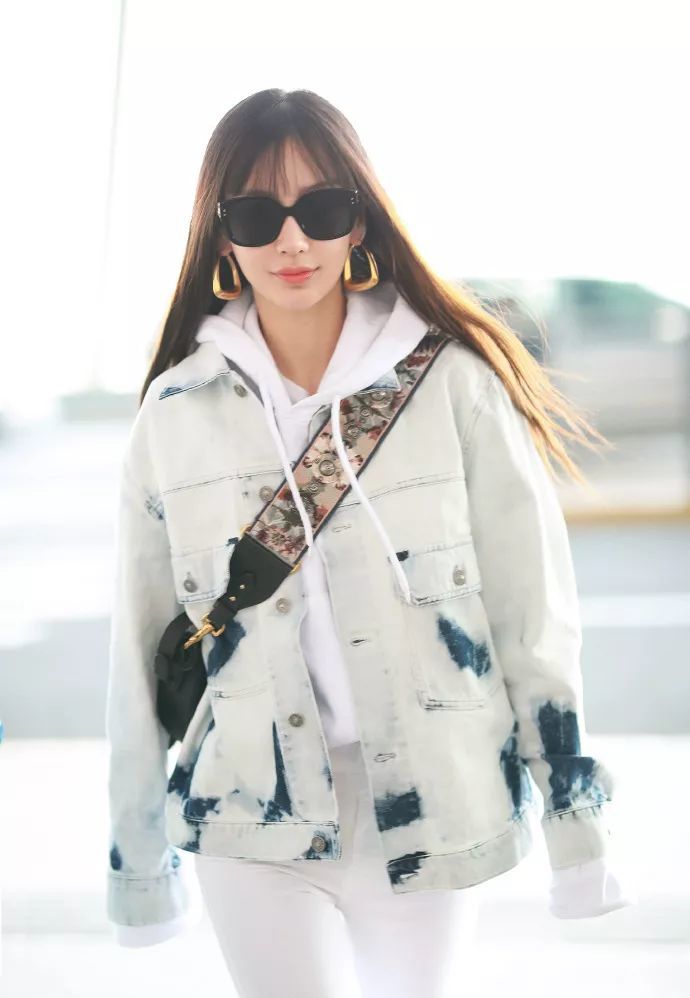 除了蓝色以外,其实炭灰黑和白色在街拍中也多见,论与印花的组合,貌似它比蓝色更能压得住台面。Angelababy这件Dior水洗牛仔外套就是最有说服力的证明。