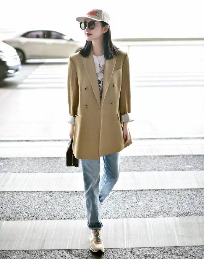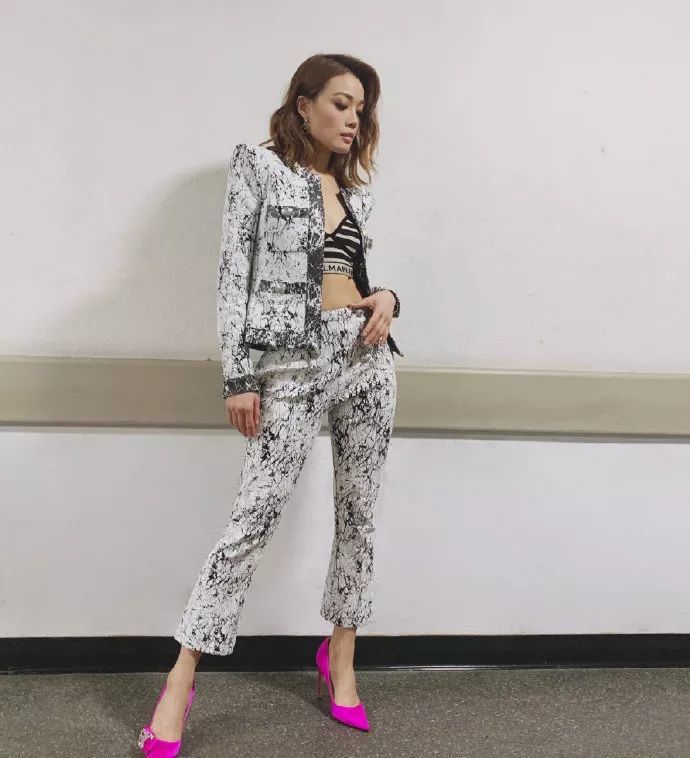 容祖儿的Balmain大理石纹套装,大垫肩西装搭配条纹内衣,帅气又风情。如果你想回到80年代,一个大垫肩足矣。