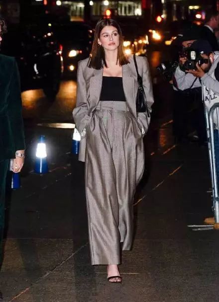 同样的搭配法则在Kaia Gerber这里也适用。Kaia参加Marc Jacobs婚礼的时候就穿了一套浅褐色的西服套装,她瘦高挑的身材与夸张的肩部线条对应在一起显得格外好看。