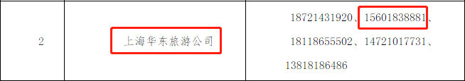 随着这份《提示》,官网公开曝光了一些冒用的旅行社名称或虚假名称,以及对外使用的网址或电话号码。之前陈女士联系的那家“中国国旅”的客服电话15601838881赫然也在其中,只是公示中冒用的是“上海华东旅游公司”。