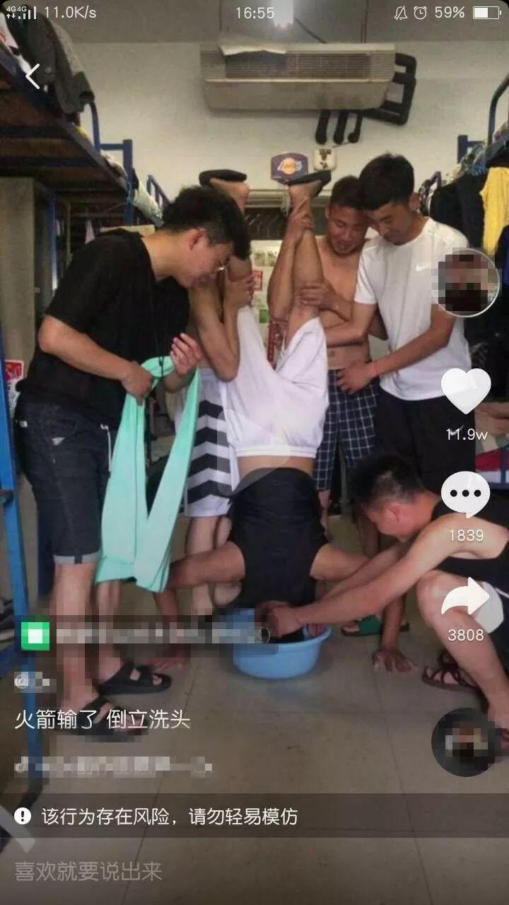 视频中,三个彪形大汉提着小伙的两条腿,小伙头朝下栽在脸盆里,两只胳膊支在地上。旁边还有两个“随从”伺候着,一个负责洗,一个负责擦。