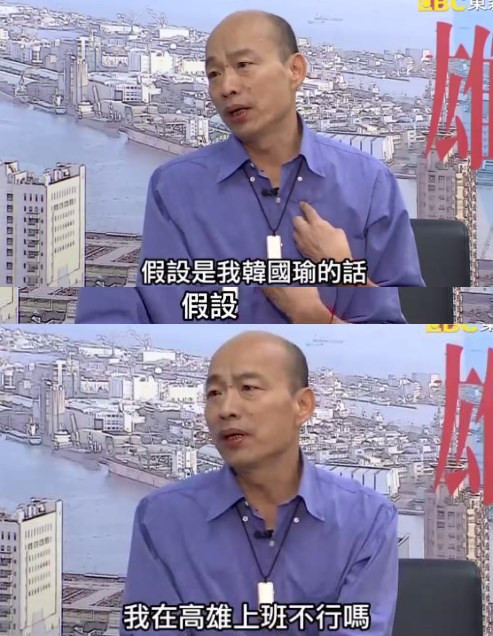 韩国瑜接受东森电视台政论节目专访表示,问他爱不爱高雄,跟问他爱不爱老婆一样,高雄市民一点都不用担心。韩国瑜还承诺,4年付出不会变,若成为候选人,假设他当选领导人,“我在高雄上班不行吗?”