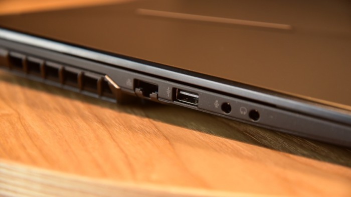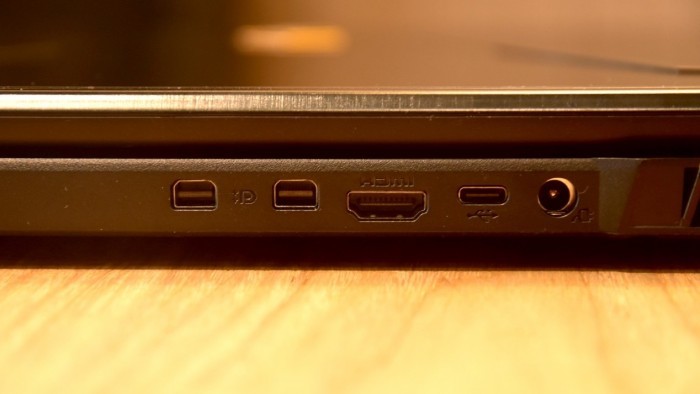 机械革命深海泰坦X9Ti-R的接口分布在了机身的左侧、右侧以及后侧。一个RJ-45网口、一个USB 2.0接口、两个独立式耳机/麦克风接口分布在机身左侧,一个SD读卡器插槽、两个USB 3.0接口分布在机身右侧,视频输出接口(包括两个Mini DP和一个HDMI)、一个USB Type-C接口和电源插孔则集中在机身的后侧。