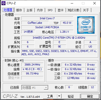 下面我们用CPU-Z、3DMark、CINEBENCH R15、CrystalDiskInfo这几款大家熟知的专业的电脑测试软件对今天的主角——机械革命深海泰坦X9Ti-R进行逐项测试,通过实际的测试参数来看看i7-9750H的表现到底如何。